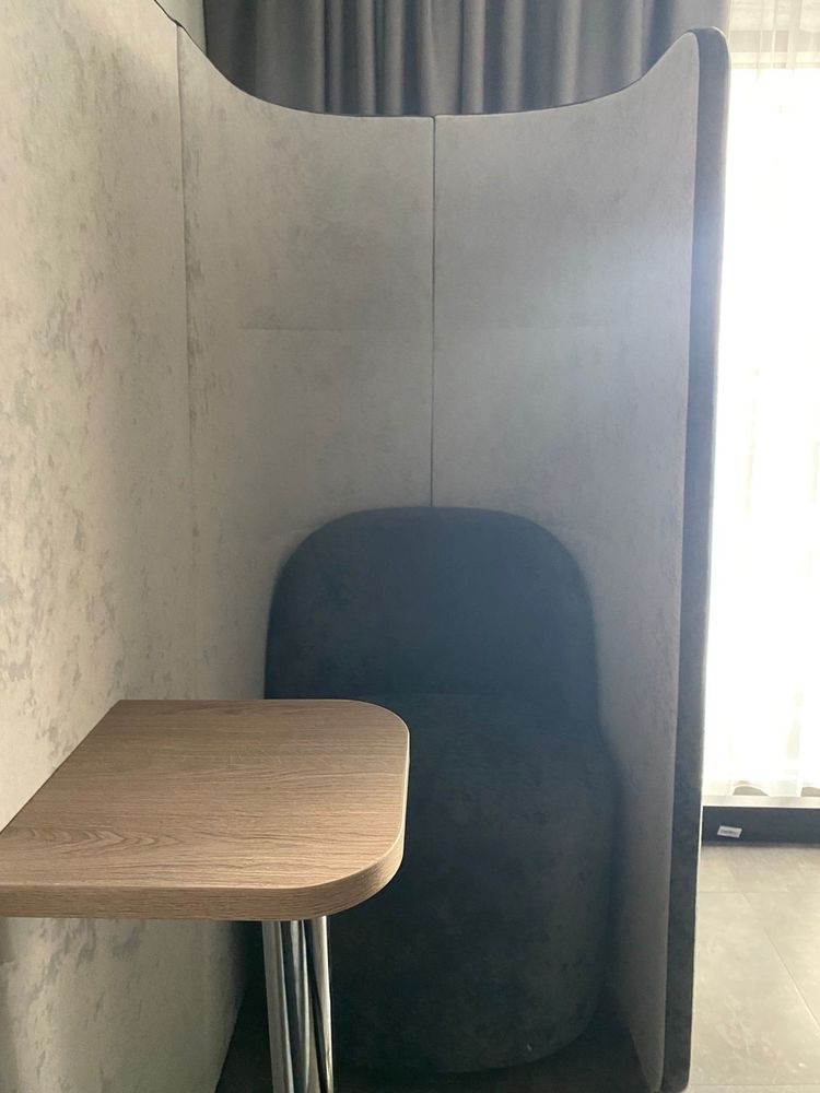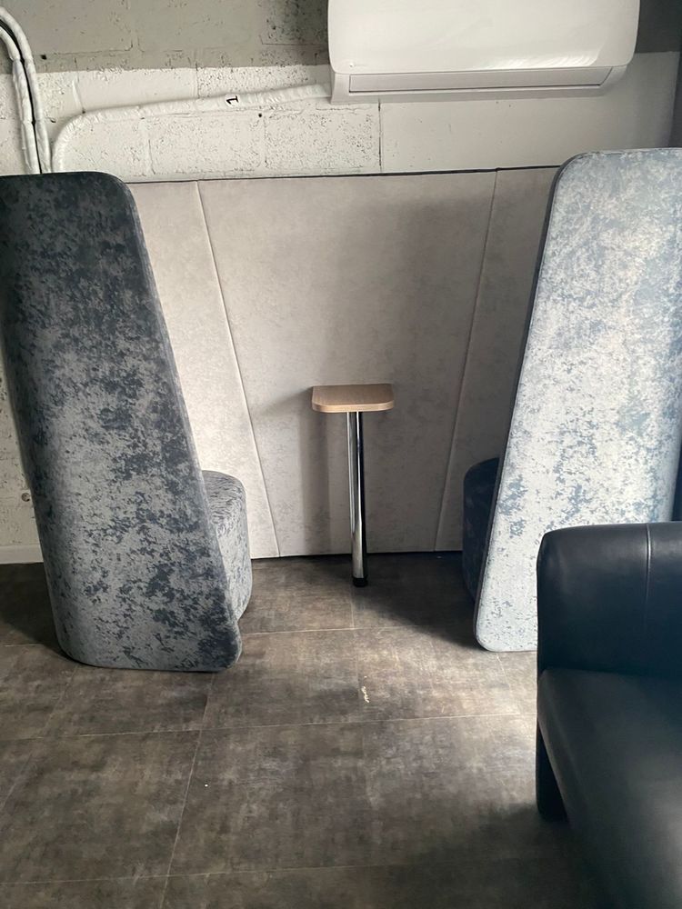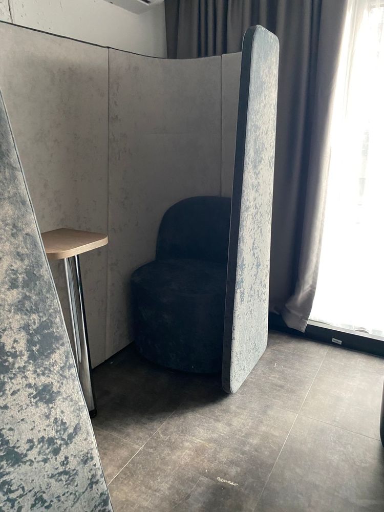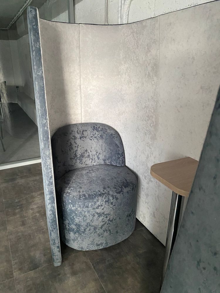 Акустическая кабина от Наяды в офисе «2ГИС», выполнена из стеновых панелей, внутренняя и наружная часть обтянуты велюром, ткань и цвет можно подобрать под любой дизайн. В составе кабины установлен столик, выполненный из ЛДСП. Такая кабина отлично подходит для создания комфортного рабочего пространства, обеспечивая хорошую звукоизоляцию и приятную атмосферу. Использование велюра как обивки не только улучшает акустические параметры, но и придаёт кабинке стильный и современный вид. ЛДСП, в свою очередь, обеспечит прочность и долговечность мебели.