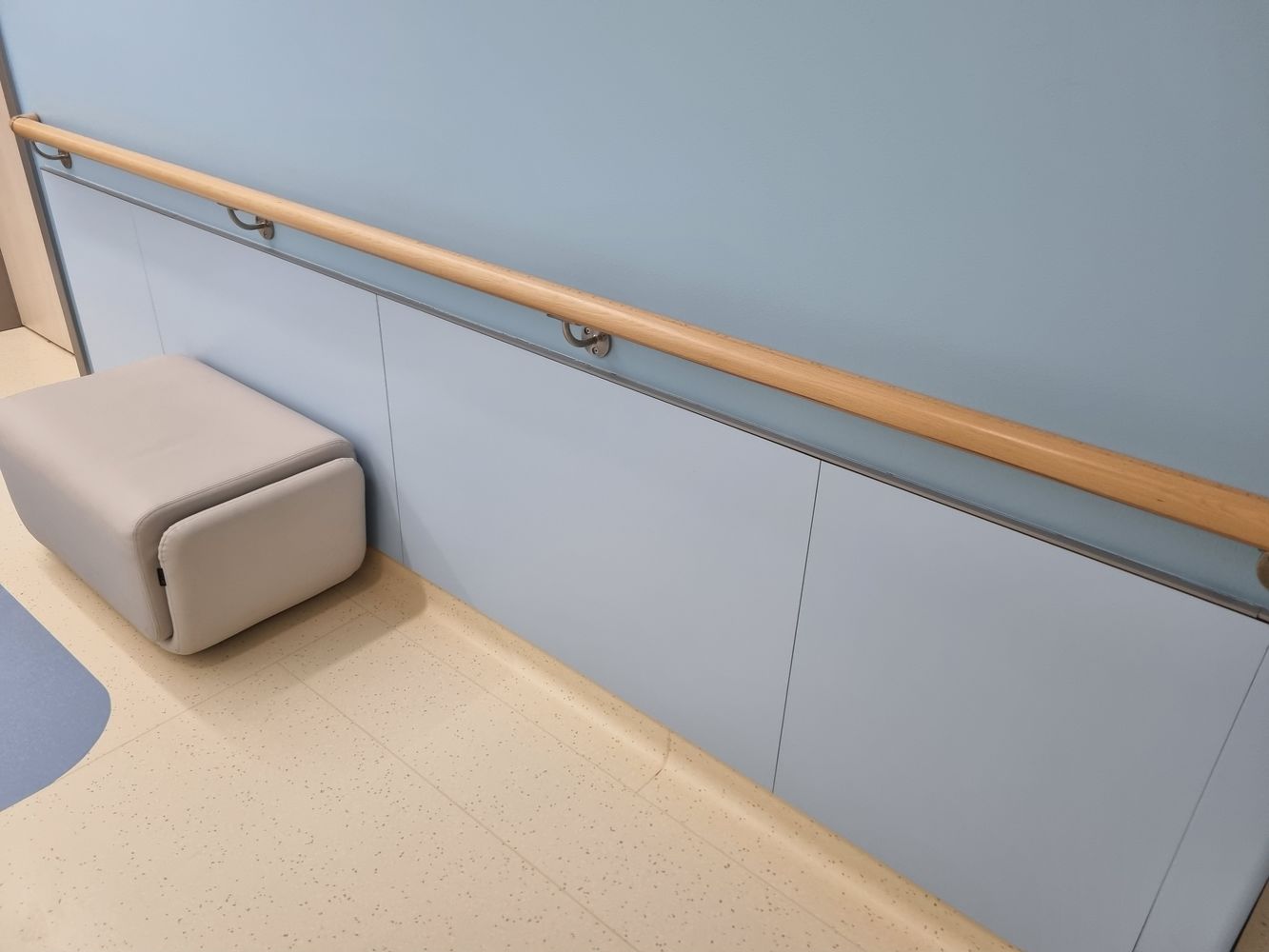 Наяда выполнила проектирование, изготовление, и монтаж отбойников для стен из HPL компакт пластика в клинике УГМК-Медицина. Также были изготовлены круглые поручни для стен облицованные пластиком. HPL компакт пластик материал, который может применятся даже в чистых зонах мед учреждений. Соответствует нормам горючести и санитарным нормам.