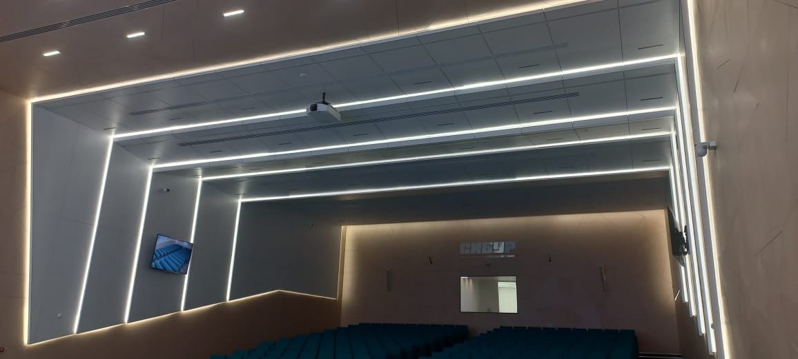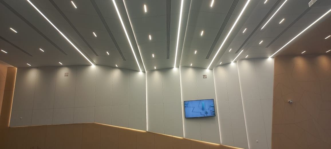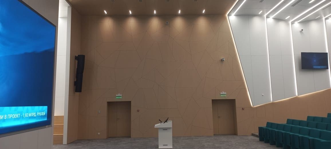 Обшивка потолков и стен в конференц-зале для компании Сибур