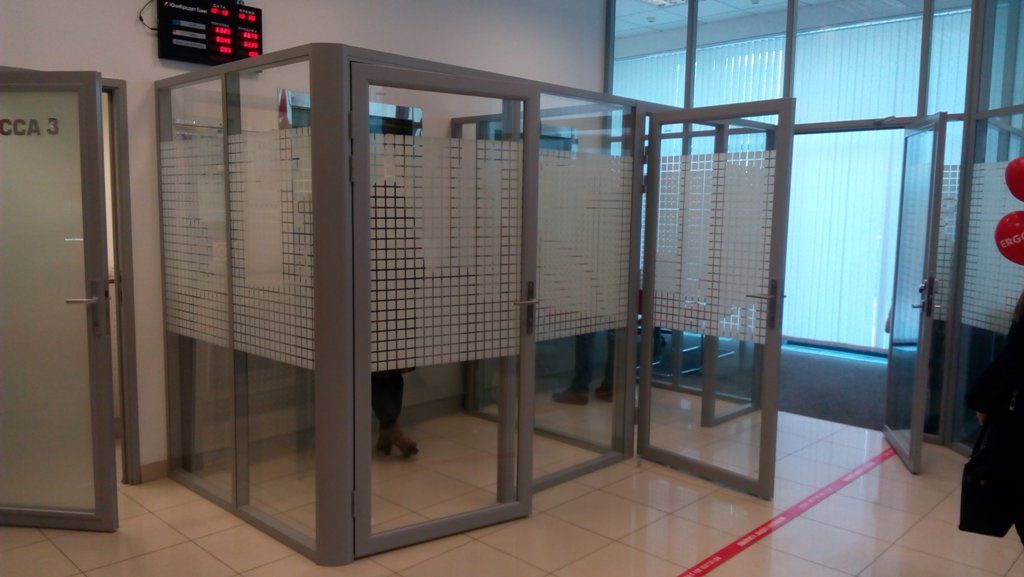 Перегородка для офиса исользуется в кассовой зоне , для безопасности посетителей установлено двойное остекление из закаленного стекла. Рисунок на стеклах повторяет общую концепцию банка.