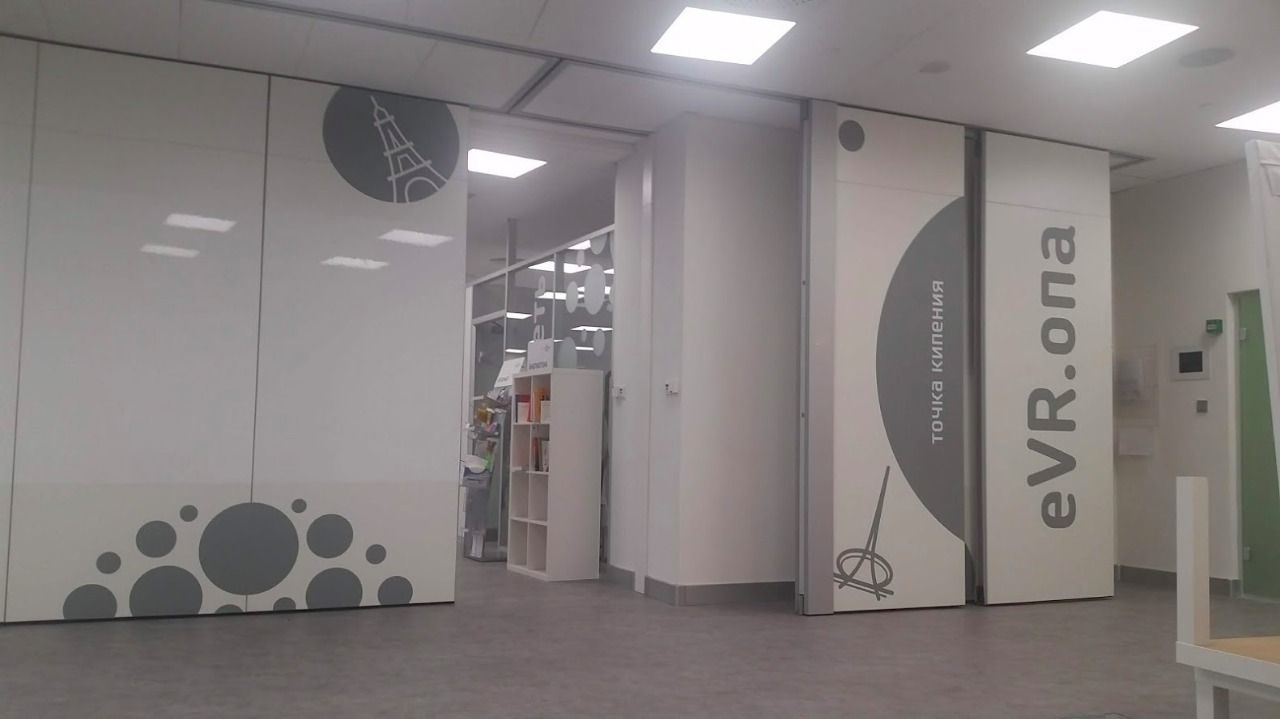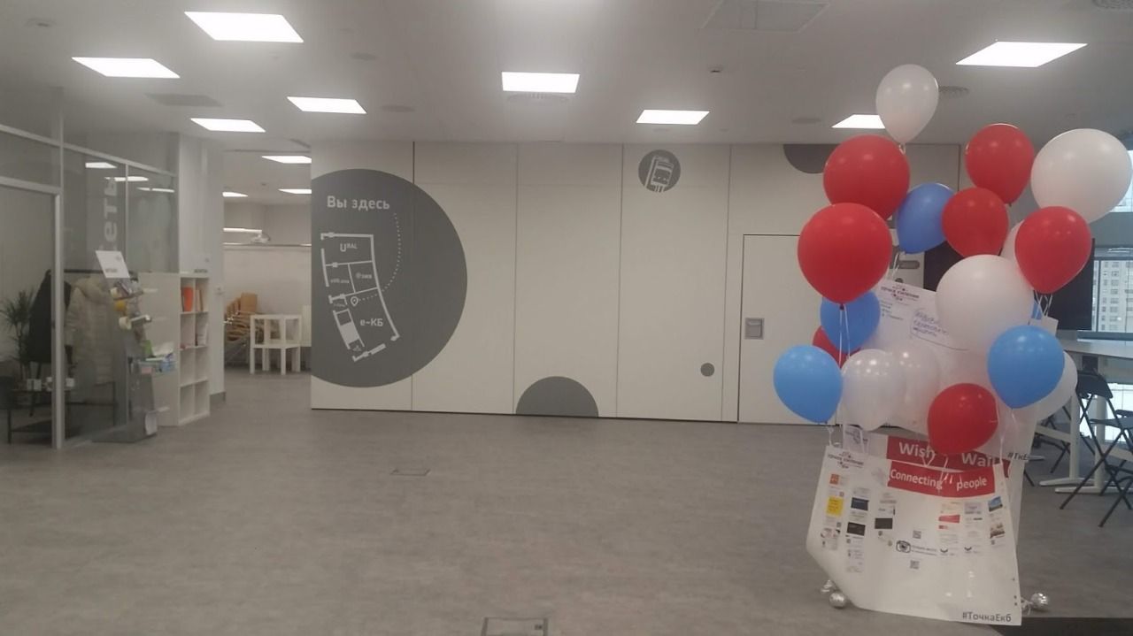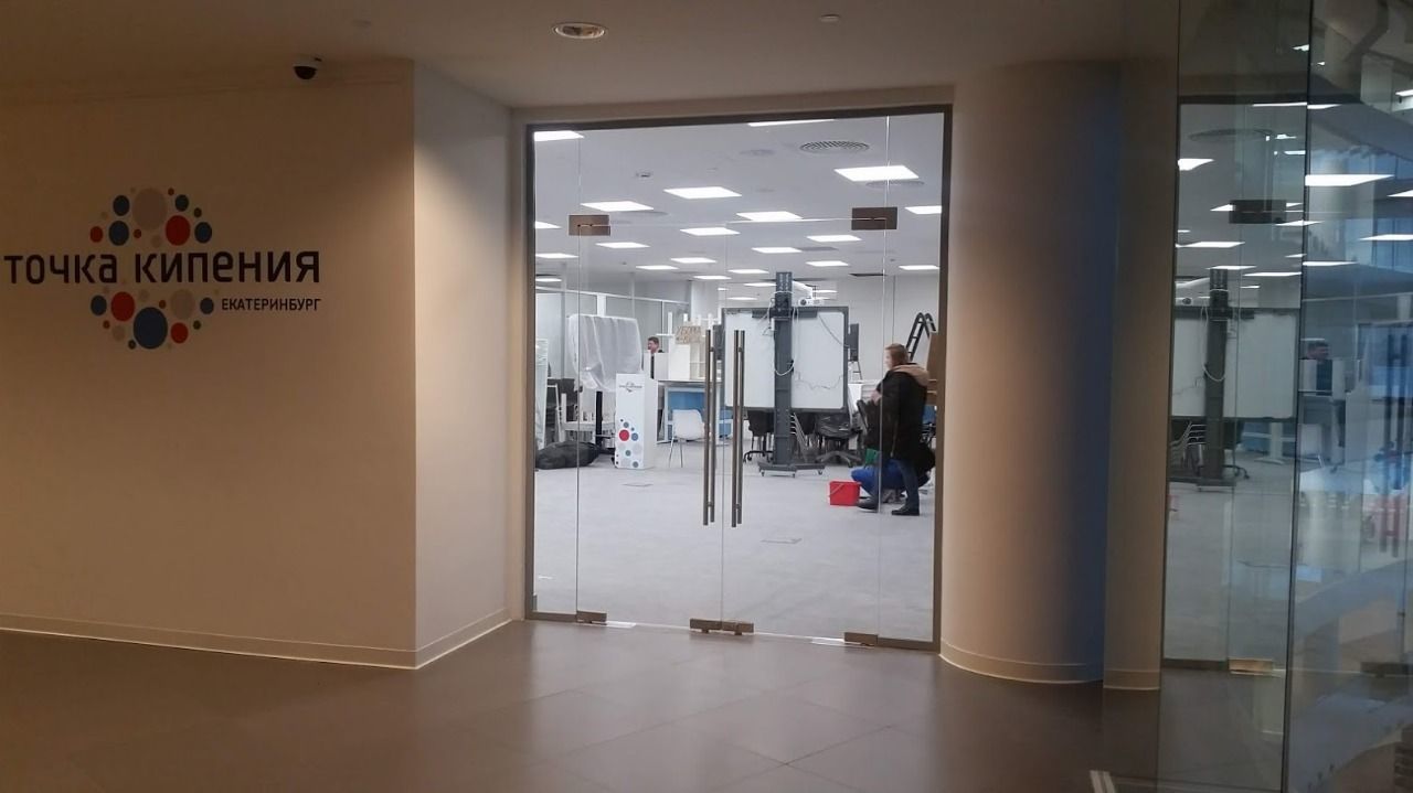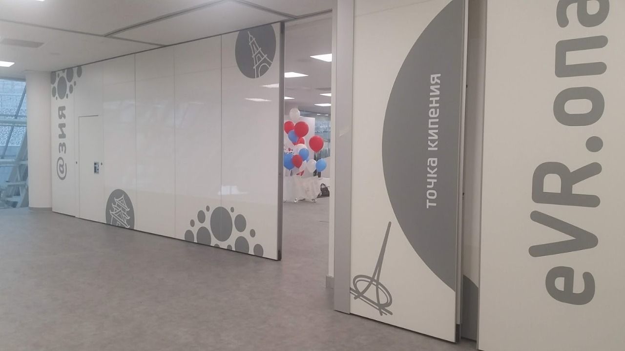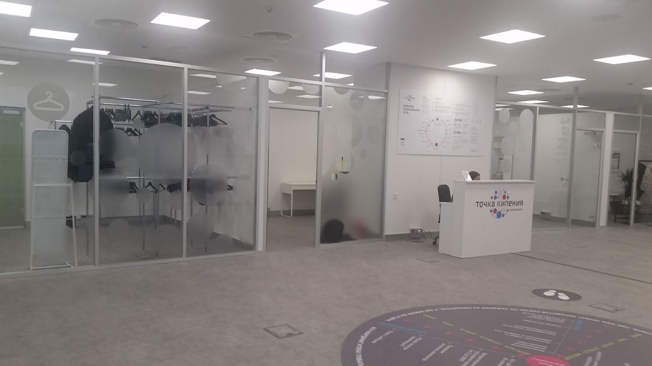 Для открытия "Точки кипения" в Ельцин Центре г. Екатеринбурга были изготовлены и смонтированы в сжатые сроки стационарные перегородки системы Nayada-Standart, цельностеклянные перегородки на зажимном профиле Nayada-Crystal и трансформируемые перегородки системы Smartwall.