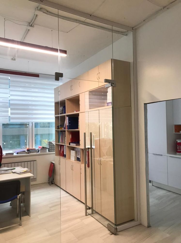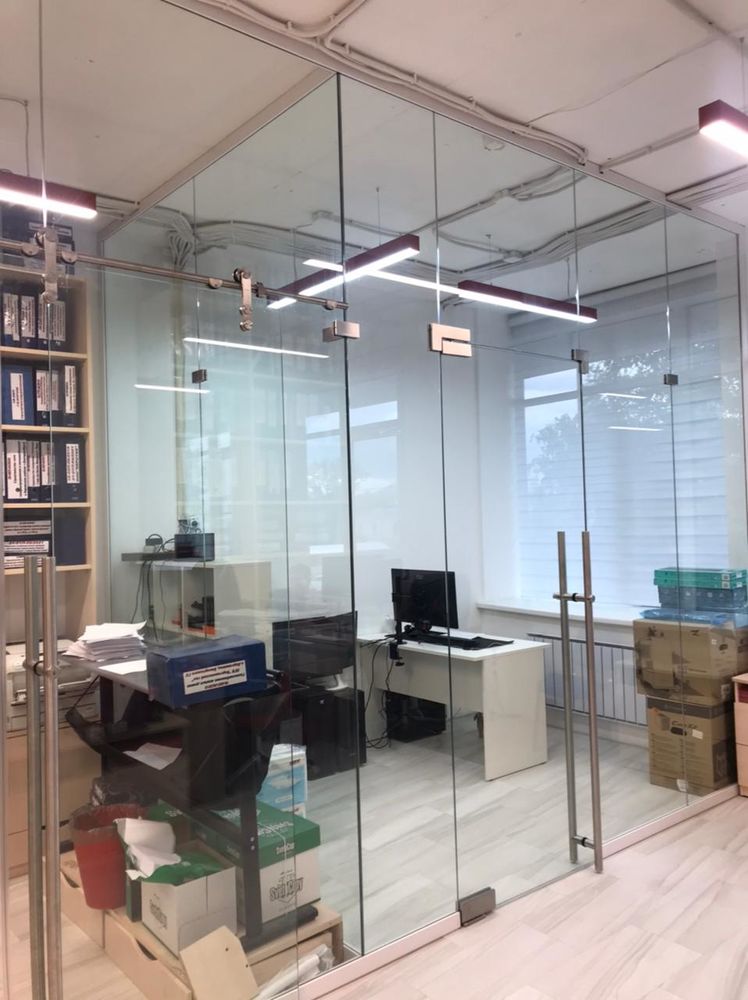 Нашей компанией были изготовлены и смонтированы цельностеклянные перегородки NAYADA-Crystal с откатными дверями на круглом треке в ЖК «Дипломат».
