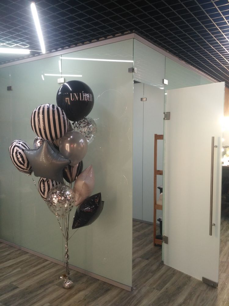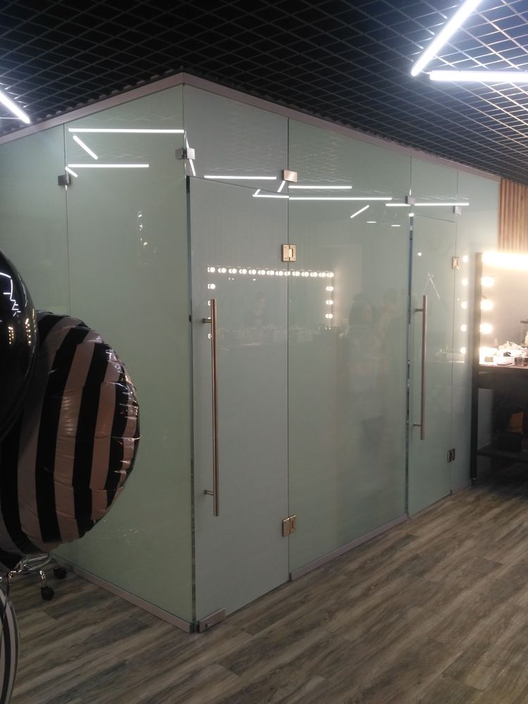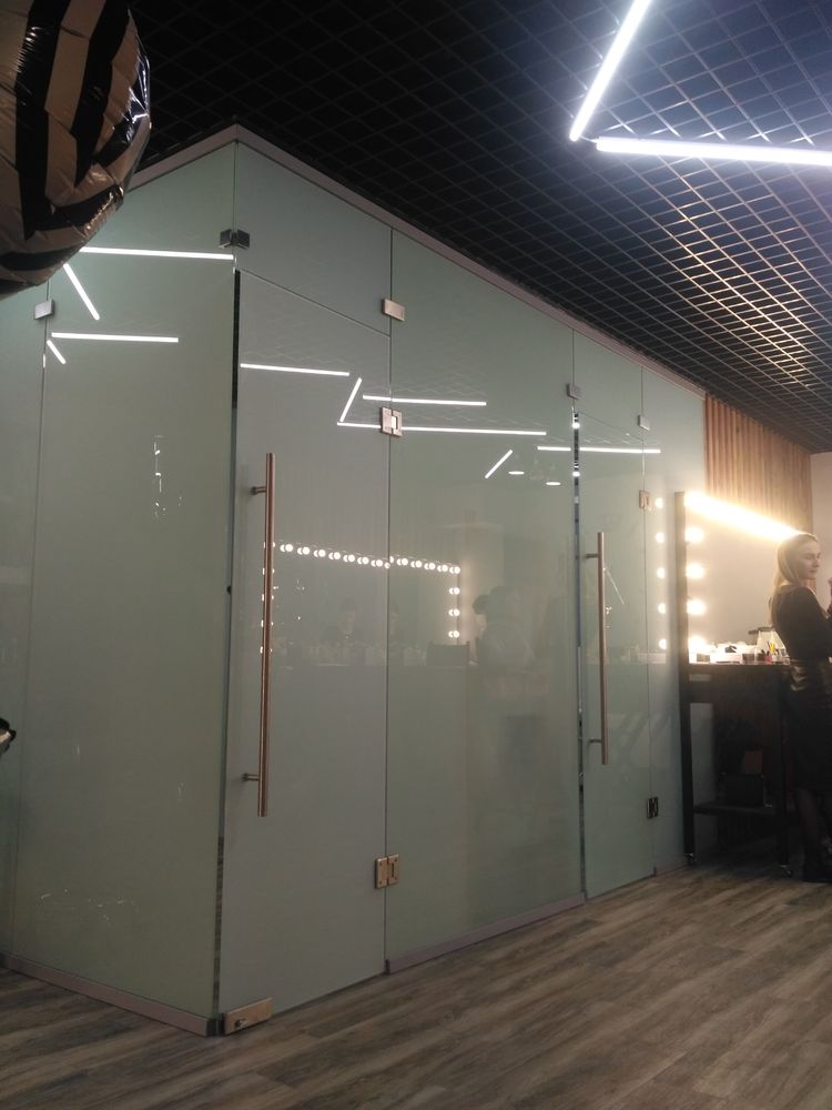 Задача: организовать рабочие места для мастеров с использованием матового стекла для создания приватности и лёгкости конструкции.