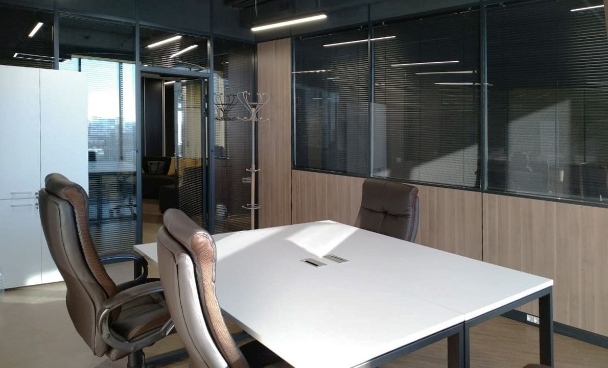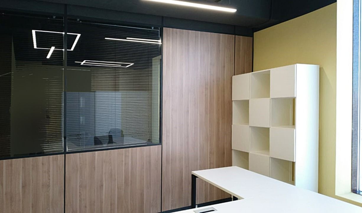 В реализации данного проекта была использована система перегородок Nayada-Standart с двойным остеклением и внутренними горизонтальными жалюзи, оперативная мебель производства Nayada марки Lavora.