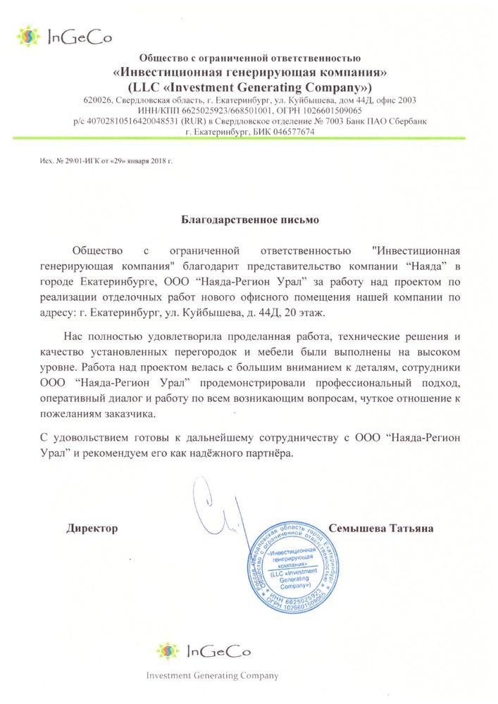 Компания NAYADA обустроила офис компании InGeCo в БЦ Панорама г.Екатеринбург