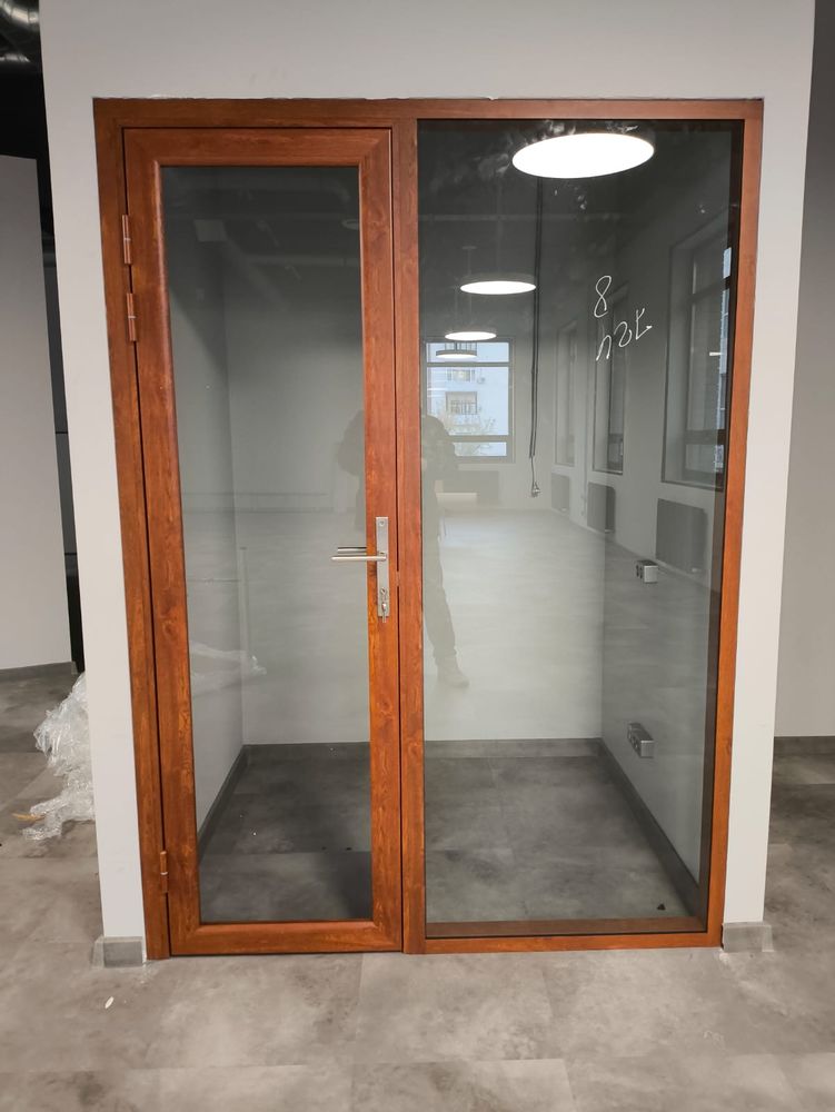 Перегородки выполнены из алюминиевого профиля, заполнение стекло закаленное прозрачное 8 мм. Двери Наяда Vitrage I, остекленные, распашные. Профиль в перегородках окрашен по каталогу Ral под дерево. Этот вариант идеально подходит для тех, кто хочет добавить натуральный и теплый акцент в офисный интерьер. Такой подход позволяет легко сочетать перегородки и двери с другими элементами оформления, создавая гармоничное пространство.
