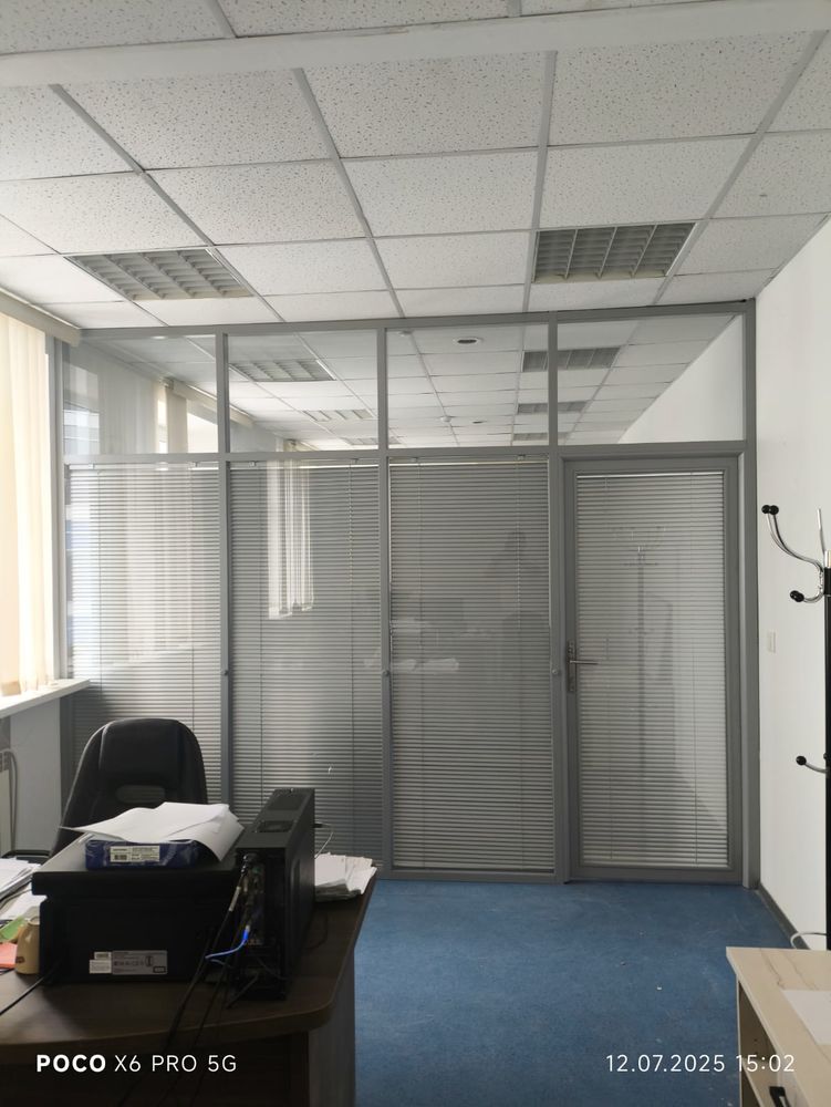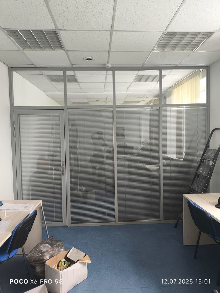 Кроме того, стеклянная перегородка оборудована жалюзи, что позволяет регулировать уровень света и конфиденциальности в зависимости от потребностей пользователей. Интегрированная дверь в конструкции обеспечивает удобный доступ и дополнительно подчеркивает эргономичность решения.
