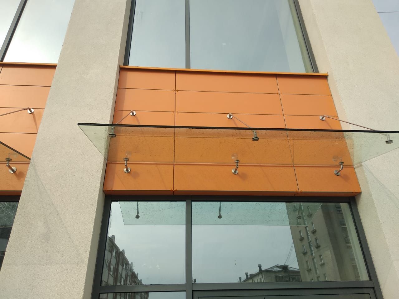 Компания Nayada изготовила и смонтировала стеклянные козырьки на тягах, стекло было использовано триплекс 8+8мм, прозрачное.