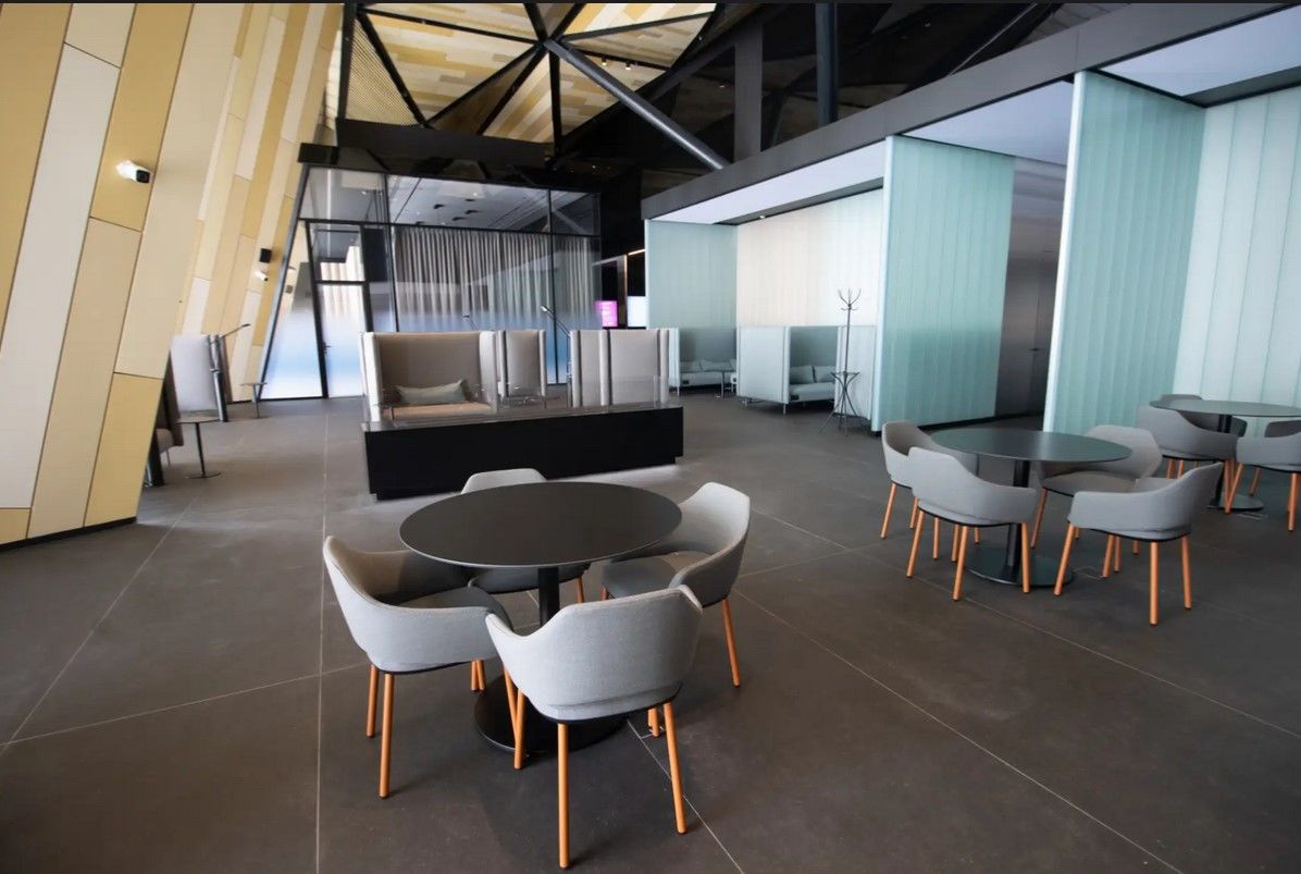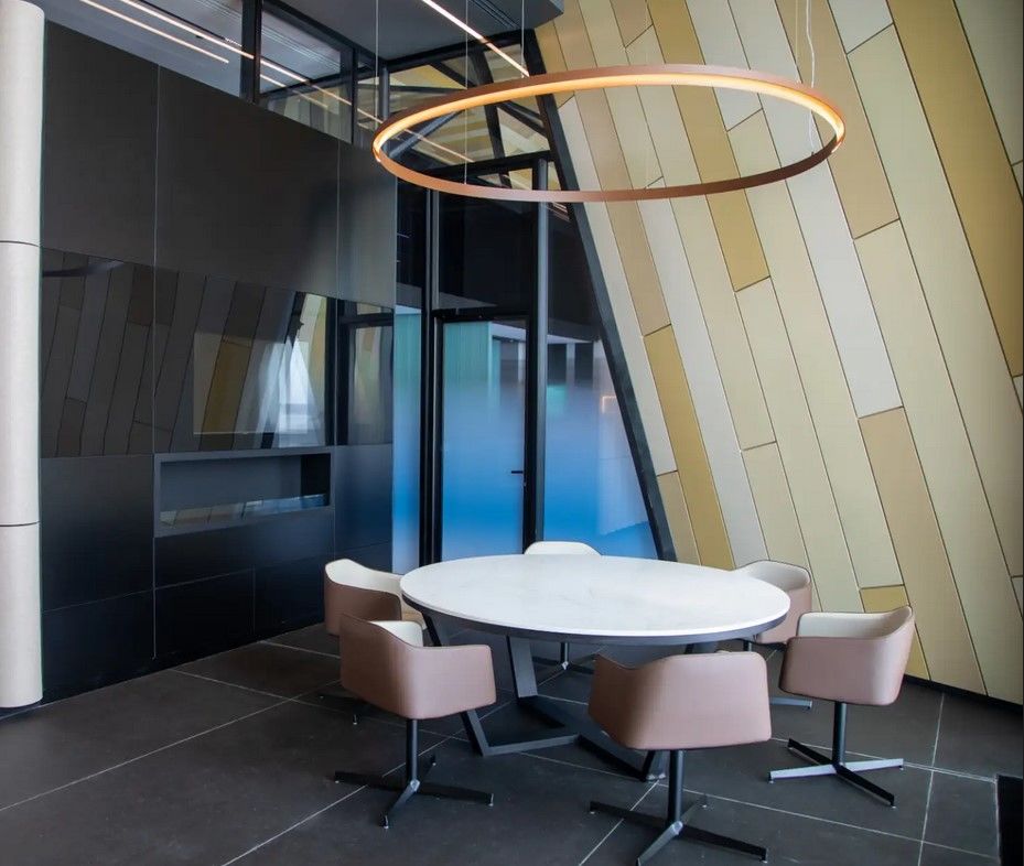 В современных офисах все чаще можно видеть стекло в качестве отделки стен. Стеклянные поверхности выглядят современно, украшают интерьер, органично сочетаются со стеклянными перегородками. В аэропорту Нового Уренгой выполнена облицовка стен окрашенным закаленным стеклом толщиной 6 мм.