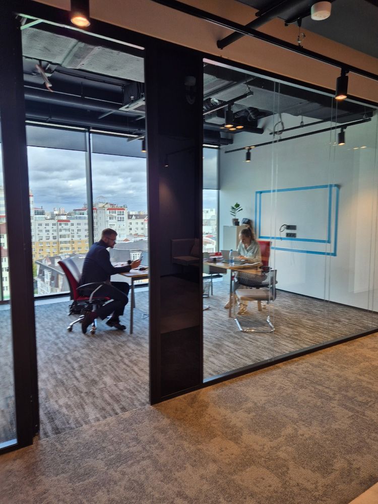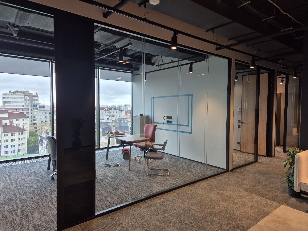 В перегородках в кабинетах руководителей установлено самое современное смарт-стекло. Смарт- или «умное» стекло — это стекло, которое умеет из матового становиться прозрачным и наоборот. Превращение происходит благодаря электрохромной жидкокристаллической пленке: изначально она матовая, но при подключении к электричеству становится прозрачной. На время переговоров или сосредоточенной работы стекло будет матовым.