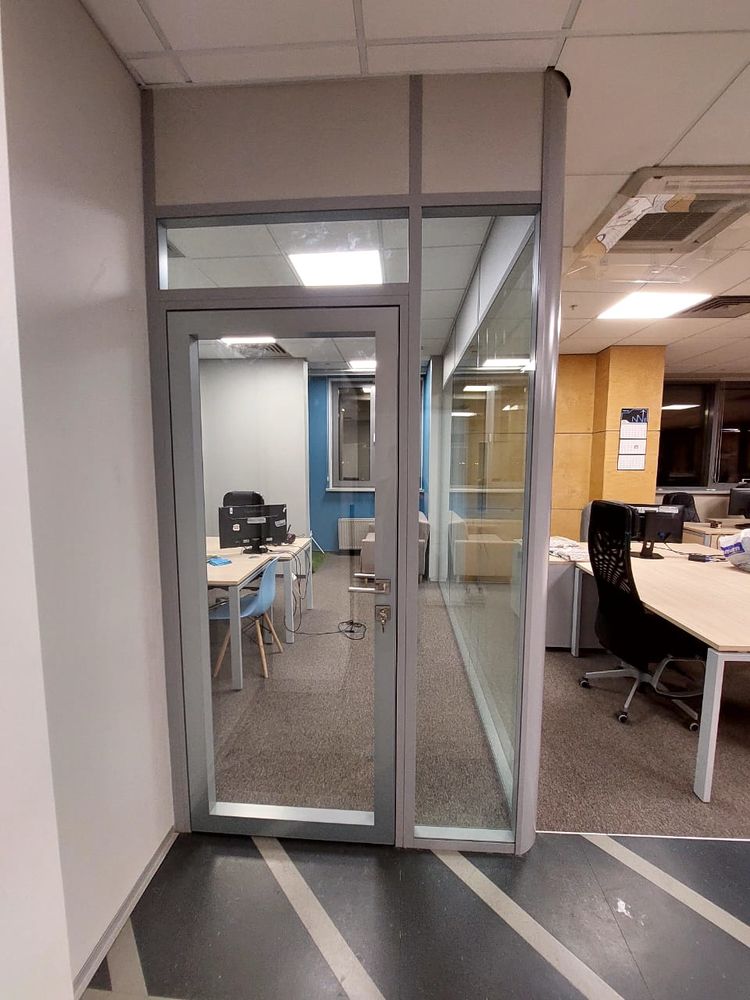 Данные перегородки выполнены из закаленного стекла, по периметру алюминиевый профиль - это открытость и легкость в помещении, они обеспечивают максимально естественное освещение. Для заполнения в перегородку можно использовать матовое стекло, выполнить рисунок по трафарету, окраска профиля по каталогу Ral, такие перегородки могут быть комбинированы для достижения необходимых дизайнерских решений, а также для обеспечения повышенной звукоизоляции за счёт установки стекла в два витража и межстекольного профиля.
