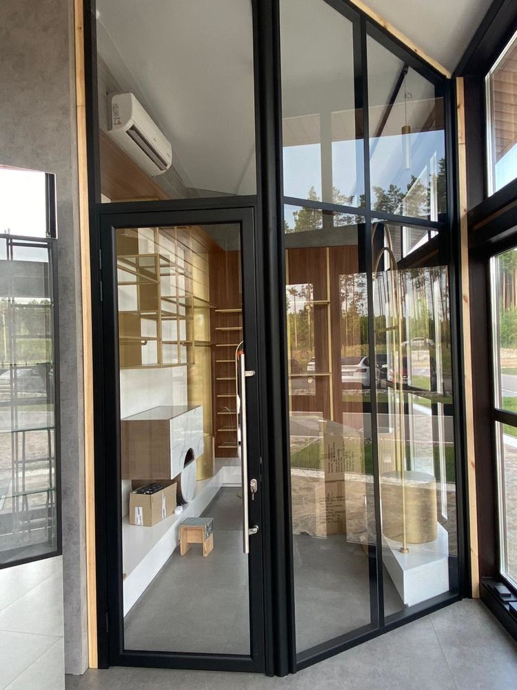 В фитнес-клубе Опера смонтированы перегородки остекленные Nayada Standart, цвет профиля черный, заполнение двойной витраж. В перегородках установлены алюминевые двери Nayada Vitrage.