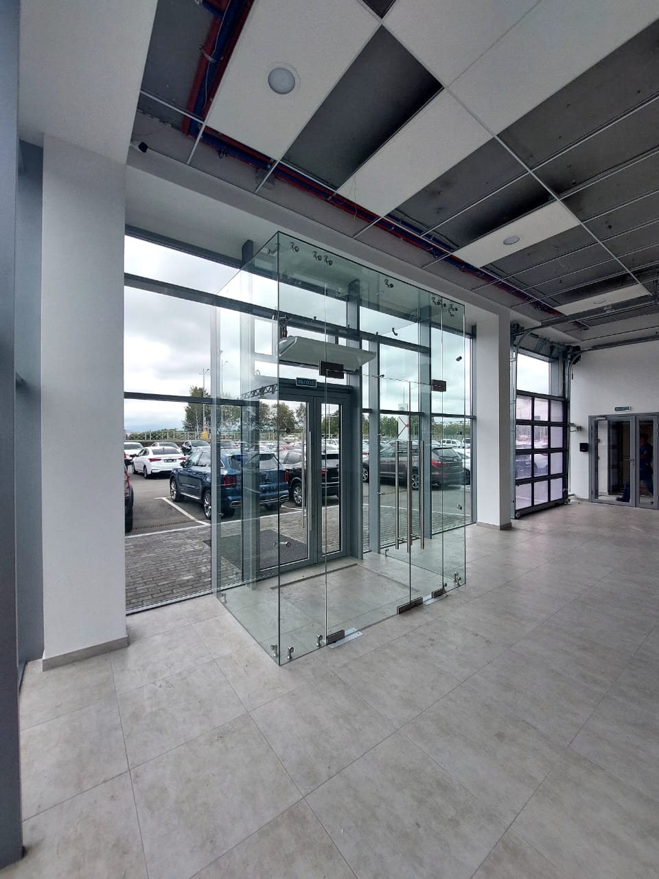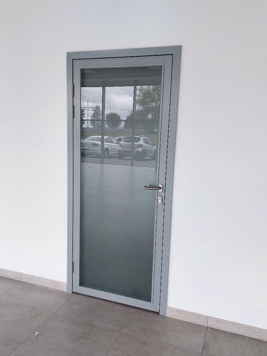 Также, в автосалоне компания Наяда смонтировала алюминиевые одностворчатые и двустворчатые двери Nayada-Vitrage I в проем. Каркас двери это алюминиевый профиль, для заполнения используется стекло 5 мм.
