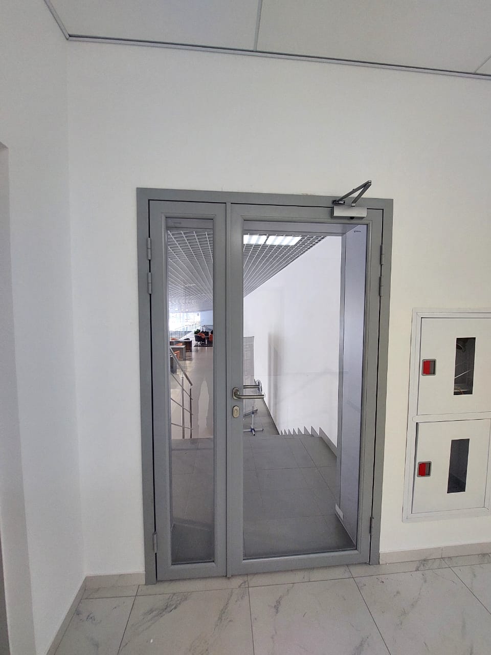 В составе перегородок смонтированы цельностеклянные одностворчатые двери. Двери оснащены необходимой фурнитурой, в т.ч. напольным доводчиком.