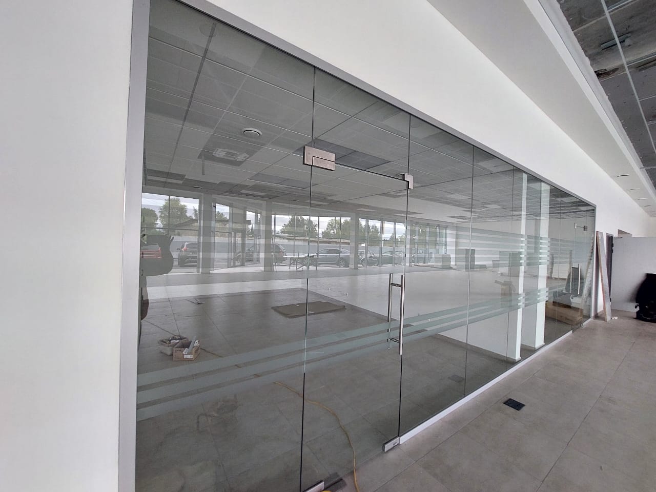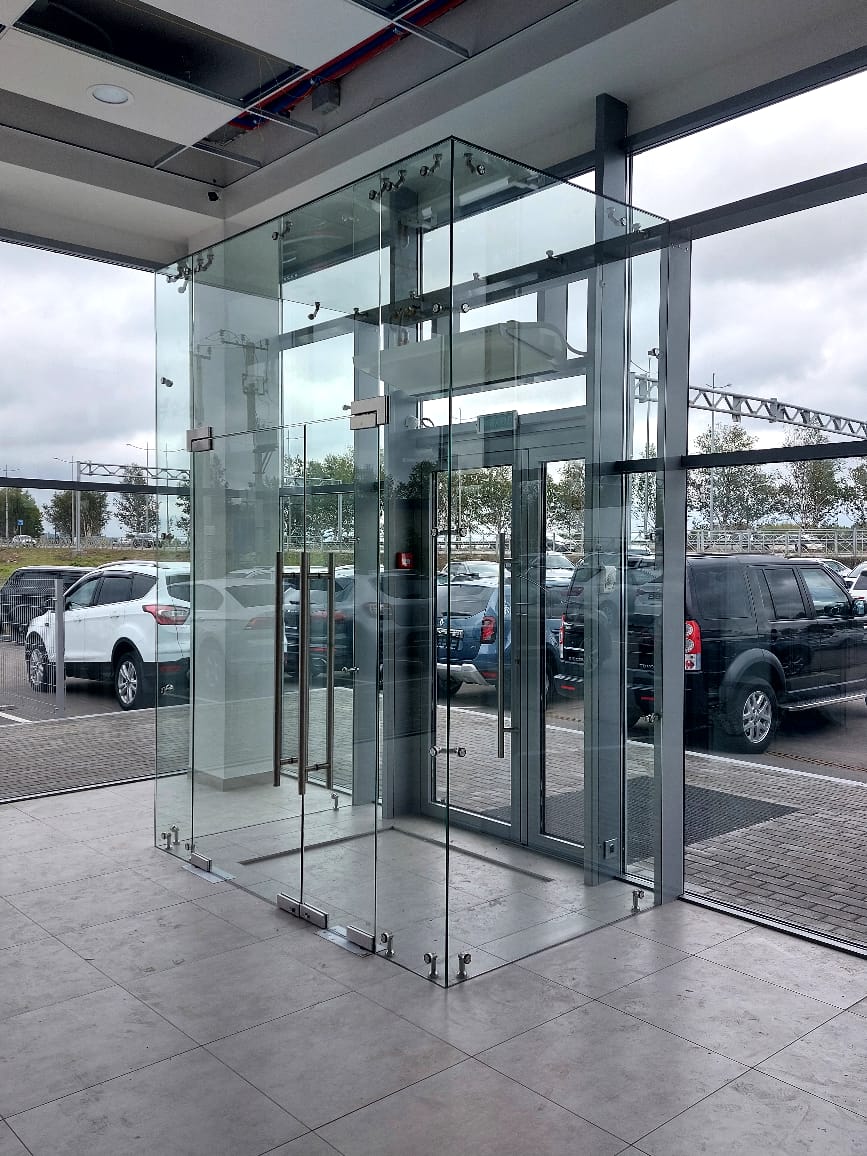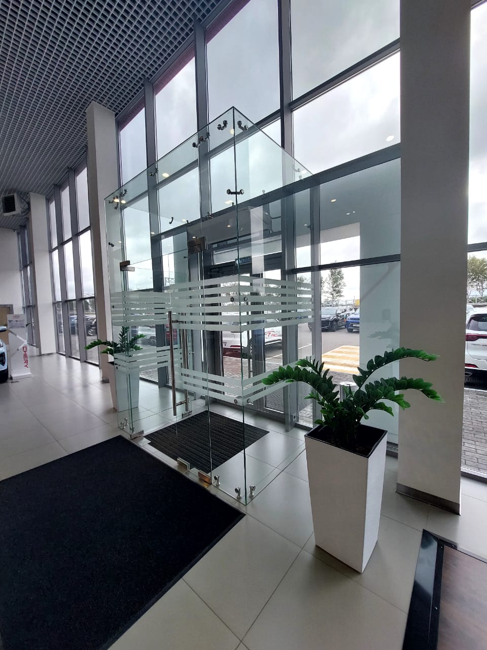 Изготовление цельностеклянной перегородки и входной группы для автосалона Chery г. Пермь