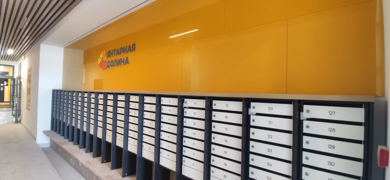 В фойе подъездов ЖК Янтарная Долина была сделана облицовка стен стеклянными панелями Nayada.