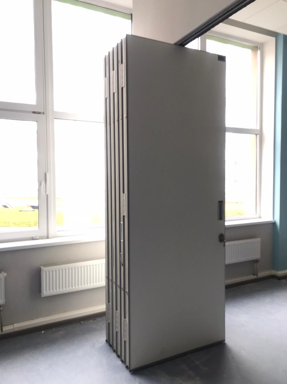 В Академическом Районе города Екатеринбурга в новой школе на 1100 мест Компания NAYADA установила складные перегородки по типу «гармошка», где секции, скреплены друг с другом, что позволяет легко и быстро разделить помещение на 2 части.