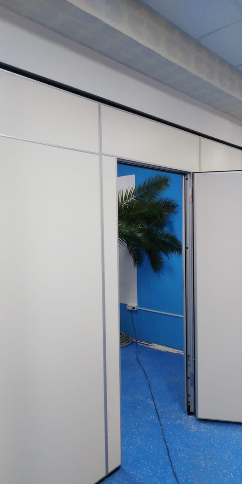 Откатная перегородка представляет собой секции, которые перемещаются на специальных роликовых подвесах по потолочным направляющим и складируются в специальных паркингах. Заполнение данной перегородки выполнено из СМЛ панелей белого цвета. В конструкции перегородки предусмотрена дверь. СМЛ является негорючим материалом, что делает его особенно подходящим для установки в учебных учреждениях, обеспечивая высокий уровень безопасности и соответствие современным требованиям.
